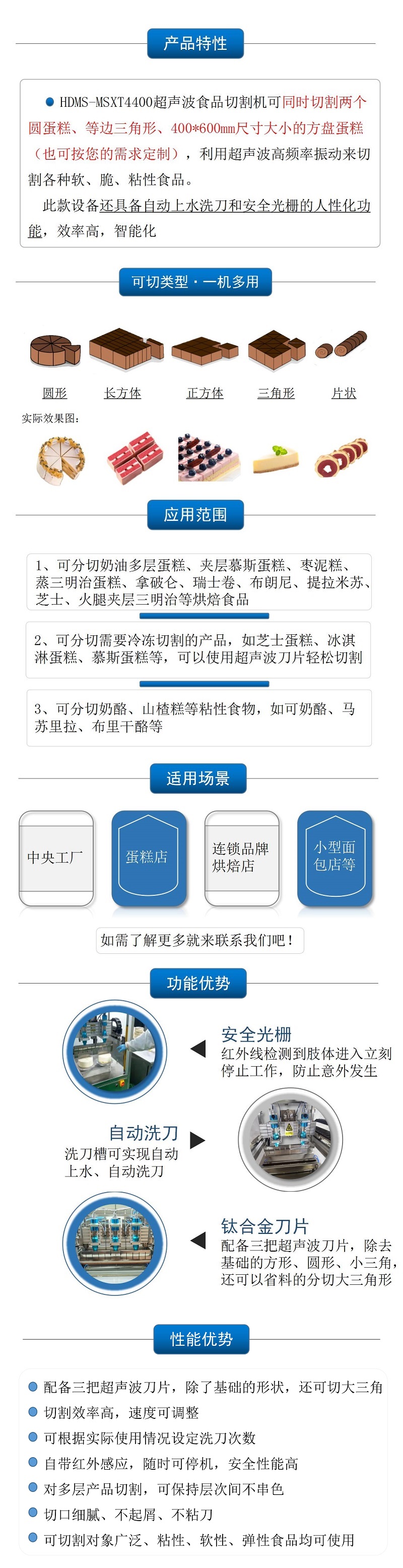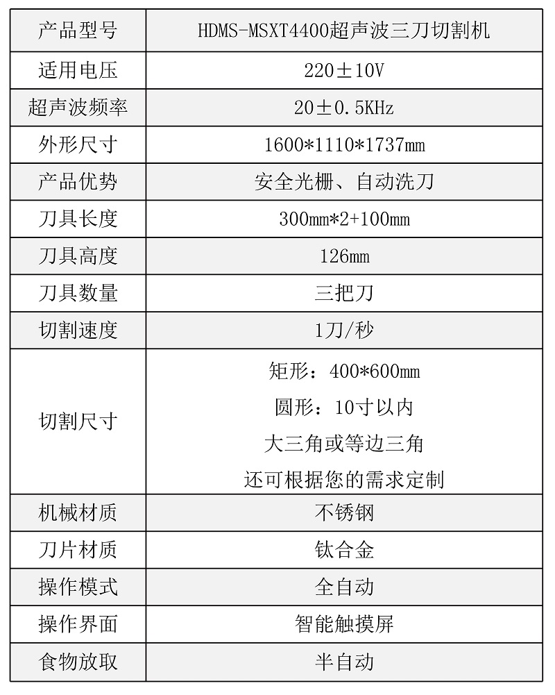 該設備配備雙把超聲波刀片,既可切方蛋糕,也可同時切兩個圓蛋糕,還具有自動上水洗刀、安全光柵的人性化功能,效率高,更方便